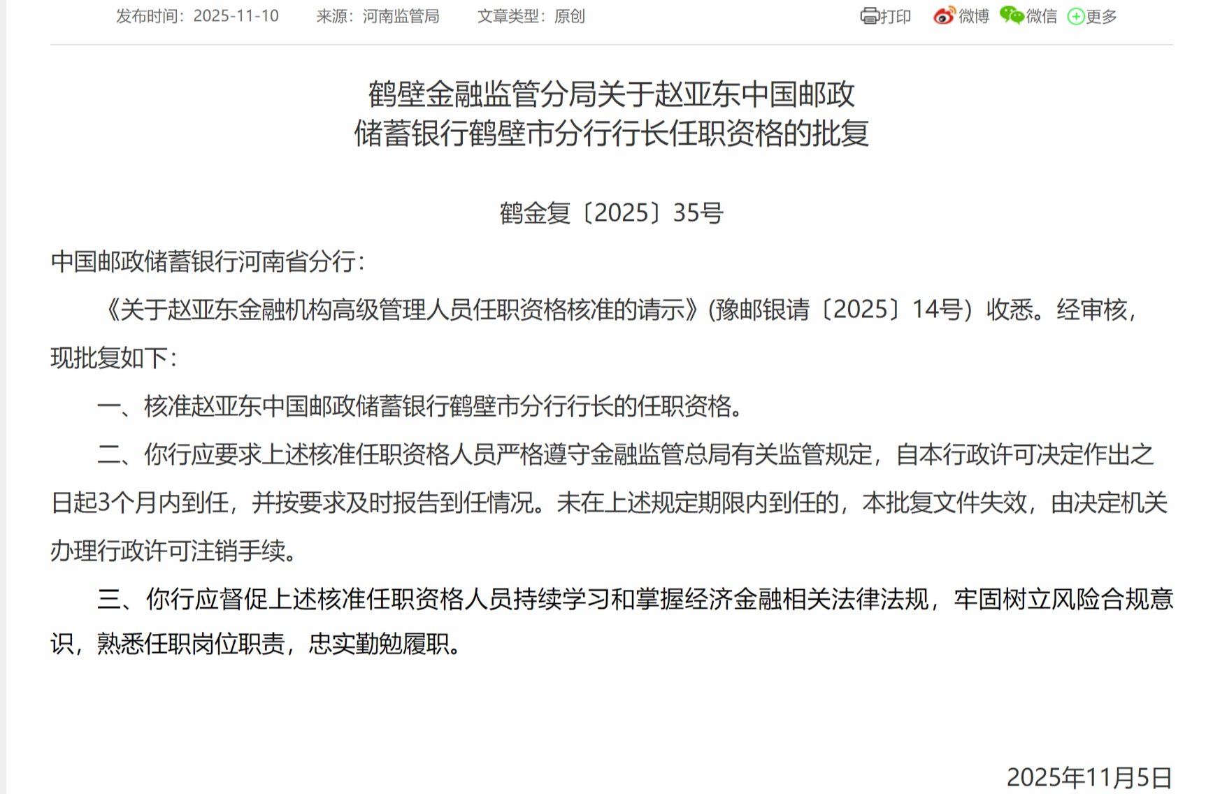 11月10日,鹤壁金融监管分局发布关于赵亚东中国邮政储蓄银行鹤壁市分行行长任职资格的批复,核准赵亚东中国邮政储蓄银行鹤壁市分行行长的任职资格。